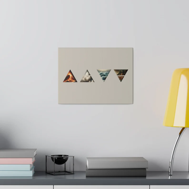 «Elementos Alquímicos» es un lienzo mate que representa los cuatro elementos clásicos: fuego, aire, agua y tierra, en formas triangulares. Esta obra destaca la armonía y el equilibrio universal, ideal para inspirar reflexión y transformación personal.